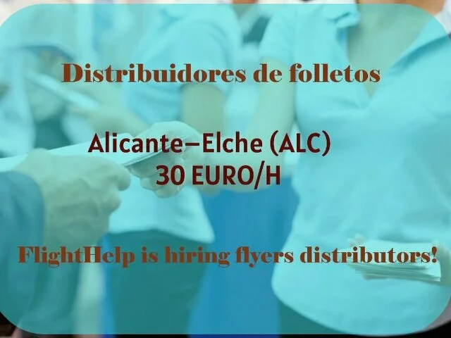FlightHelp busca personas responsables y profesionales para trabajar como Agentes de Distribución de Folletos en el Aeropuerto de Alicante-Elche. El puesto consiste en informar a pasajeros afectados por retrasos o cancelaciones de vuelos mediante la entrega de folletos informativos sobre sus derechos de compensación. No hay venta involucrada.