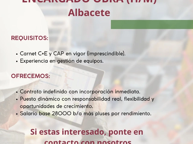 ¿Tienes experiencia en obra y te gusta coordinar equipos, maquinaria y el trabajo diario? Buscamos un perfil que conozca la obra desde dentro y tenga capacidad para coordinar equipos, maquinaria y plazos de ejecución.