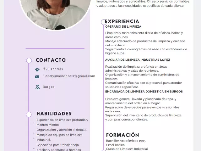 Hola mi nombre es Tatiana tengo 25 años y actualmente me encuentro en búsqueda activa de empleo. Estoy interesado/a en cualquier oportunidad laboral que se ajuste a mi perfil, ya sea a tiempo completo, parcial o por horas. Soy una persona responsable, puntual y con ganas de trabajar, me adapto con facilidad y aprendo rápido. Tengo disposición para desempeñar...