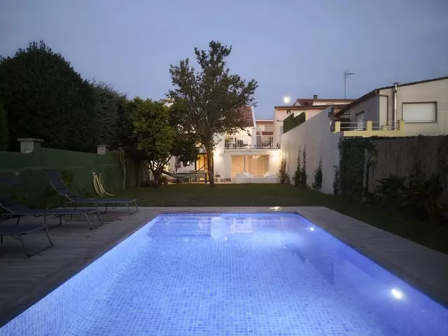 Imagina tus noches de verano aquรญ: luces suaves, una cena al aire libre, la piscina iluminada con la puesta de Sol al fondo