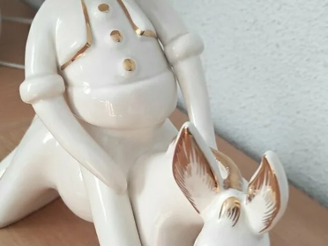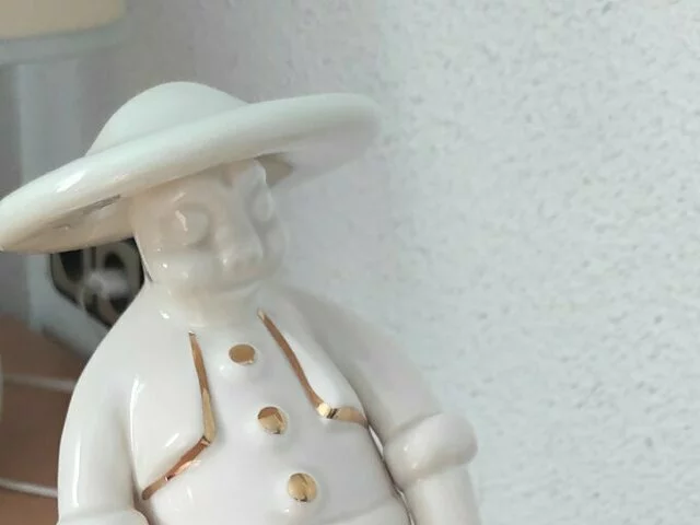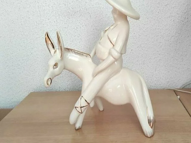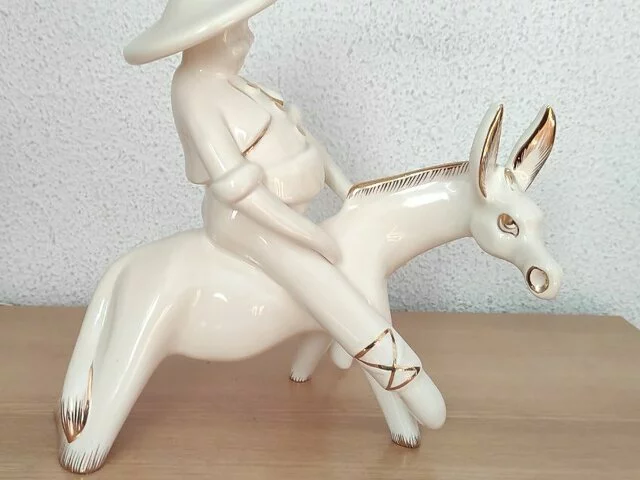 Figura del famoso Sancho Panza y su burro Rucio, en color blanco y matices dorados. Tamaño aproximado 28(alto)x 32 (ancho). No tiene ningún desperfecto. Siempre en vitrina. Recogida en zona Alcampo Moratalaz.