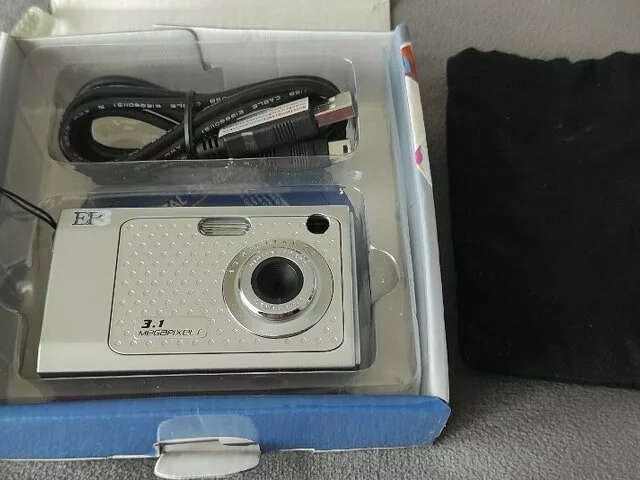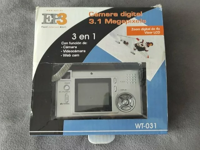 Cámara digital, promoción del periódico "El Pais", cámara de 3,1 megapixels WT-031. En color plata. Sin apenas uso. Muy ligera y compacta. Contenido (cámara, CD, funda, cinta y conector USB. Medidas aproximadas en centímetros: 9x5x2. Peso aproximado 85 gs. Recogida en metro Barajas (linea 8).