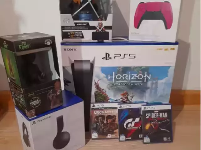 Paquete Sony PlayStation 5 con 2 controles (PS5), 4 juegos, auriculares y 2 soportes para controles