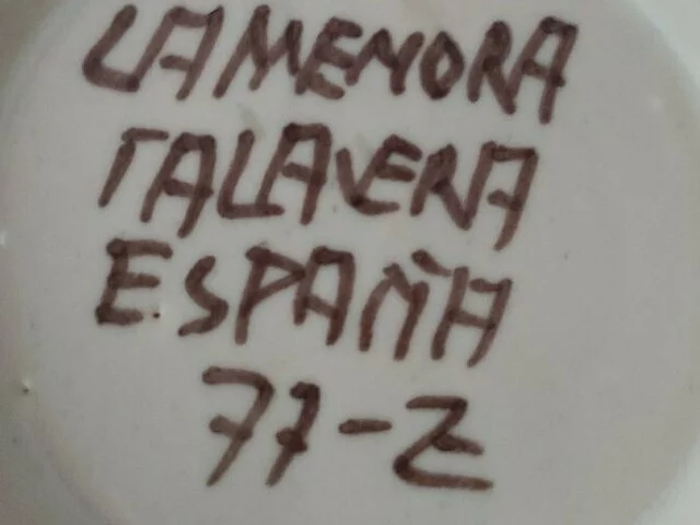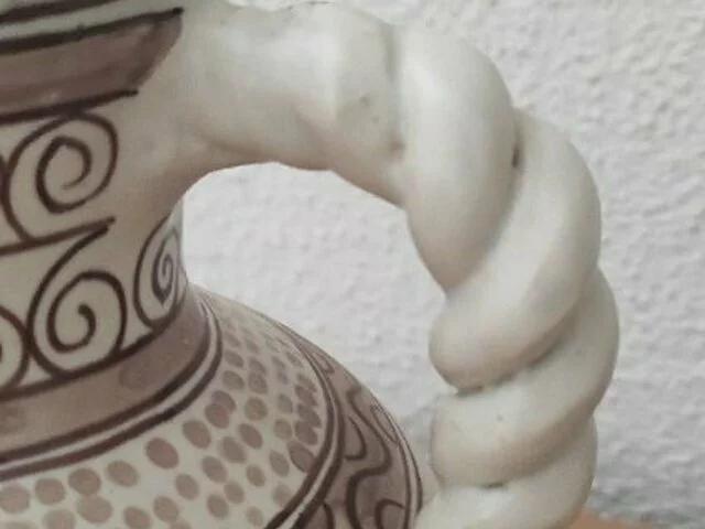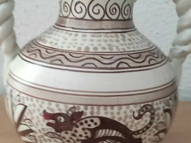 Jarron de cerámica de Talavera, con 2 asas de cordón en tonos blanco y marrón. Medidas aproximadas 23 altura, diámetro18, base 8. Recogida en zona Alcampo Moratalaz.