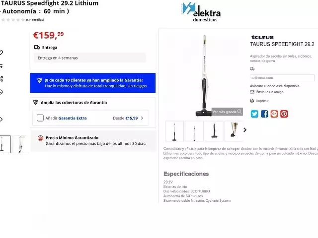 ASPIRADORA VERTICAL TAURUS. MUY BUENA MARCA EN ELECTRODOMÉSTICOS. CÓMODA, EFICAZ Y FÁCIL DE USAR. SIN CABLE . CON RUEDAS DE GOMA PARA UN FÁCIL MANEJO Y CUIDADO DE TODO TIPO DE SUELOS, INCLUSO MUY DELICADOS . BATERÍA DE LITIO , 2 VELOCIDADES : ECO / TURBO . SISTEMA DOBLE DE FILTRACIÓN CYCLONIC SYSTEM . INICIO / PARO CON UN SOLO GESTO. INDICADOR DE CARGA . FILTROS LAVABLES . ZAPATA CON TURBOBRUSH . 29.2 V DE POTENCIA . AUTONOMÍA DE 1 HORA . 3 ´ 6 KG DE PESO . MEDIDAS : 63´ 5 x 23 x 17 CM . CON SU CARGADOR . APENAS HA SIDO UTILIZADA. TIENE MUY POCO USO. EN PERFECTAS CONDICIONES.