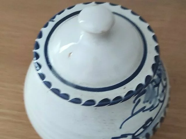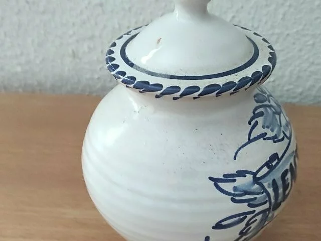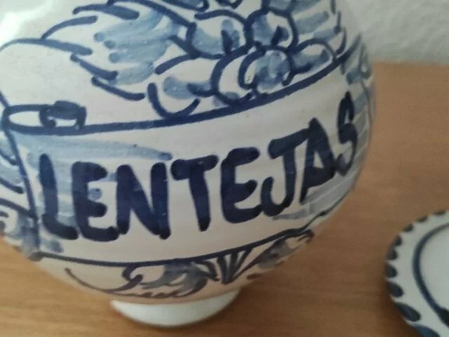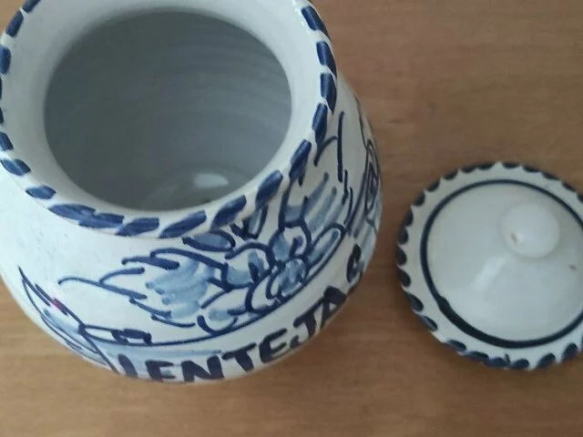 Tarro de cerámica para legumbres (lentejas) de cerámica de Talavera de la Reina. Medidas aproximadas 20x14. Base 5,5. Con decoración floral en tonos azules. Muy bonito. Recogida en zona Alcampo Moratalaz