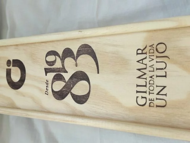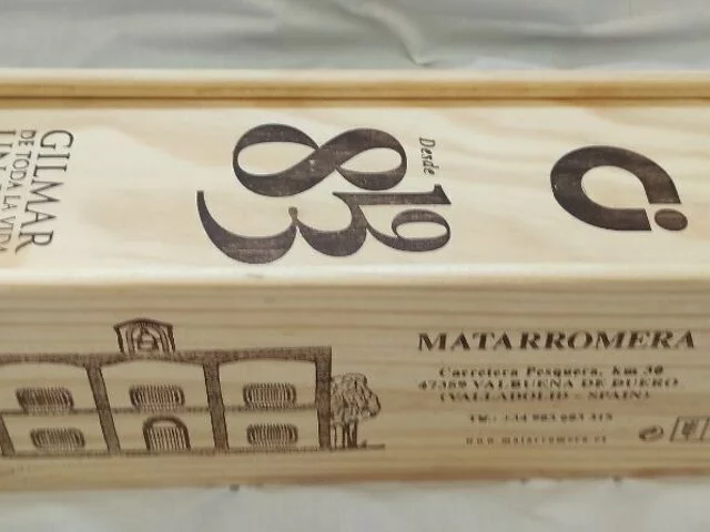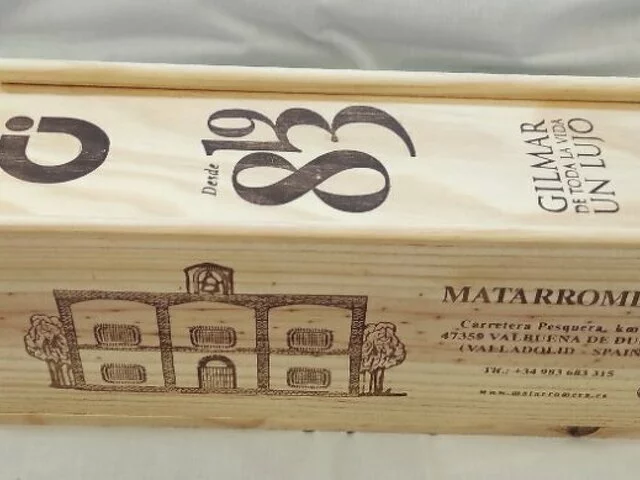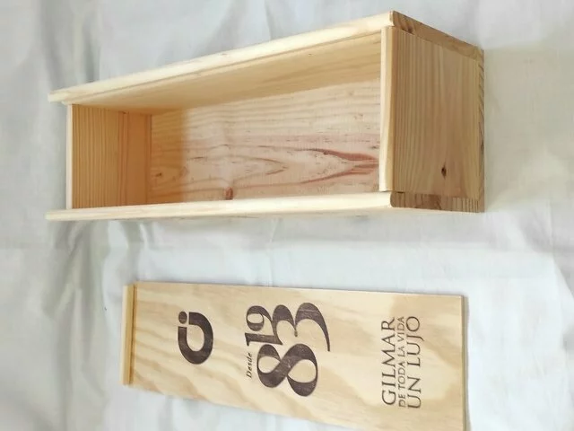 Elegante caja de madera para guardar una botellas de vino tamaño magnum con tapa corredera. Está en perfectas condiciones. En madera natural ideal manualidades, almacenaje, decoracion, estanterias, cajoneras, organizadores...Medidas aproximadas en centímetros: 38x12x12,5. Tiene partes grabadas como se ve en las fotos.