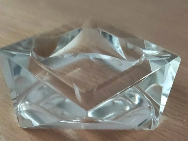 Cenicero de cristal macizo transparente, de muy buena calidad. Forma muy original. Medidas aproximadas 13x13. Recogida en zona Alcampo Moratalaz. Como nuevo.