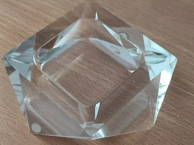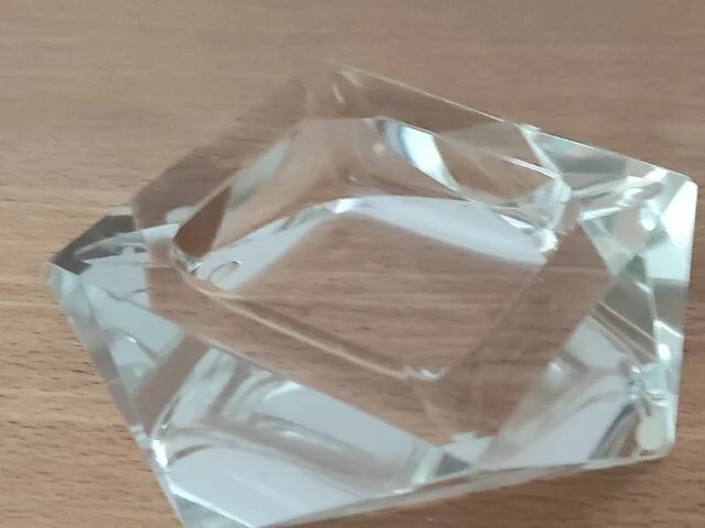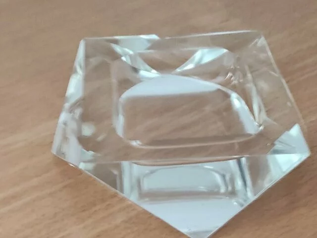 Cenicero de cristal macizo transparente, de muy buena calidad. Forma muy original. Medidas aproximadas 13x13.Recogida en zona Alcampo Moratalaz. Como nuevo.