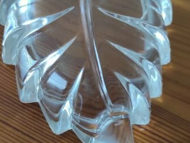Cenicero de cristal tallado en forma de hoja. Nuevo, falta la parte metálica para apoyar el cigarillo. Cristal tallado de muy buena calidad. Medidas aproximadas 14x8.