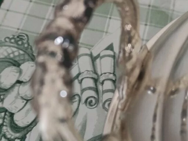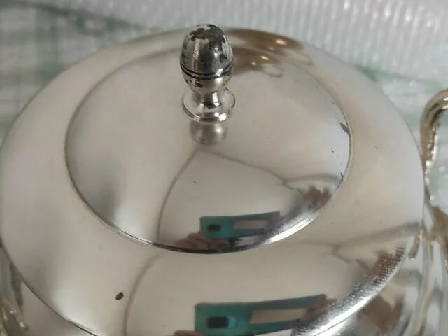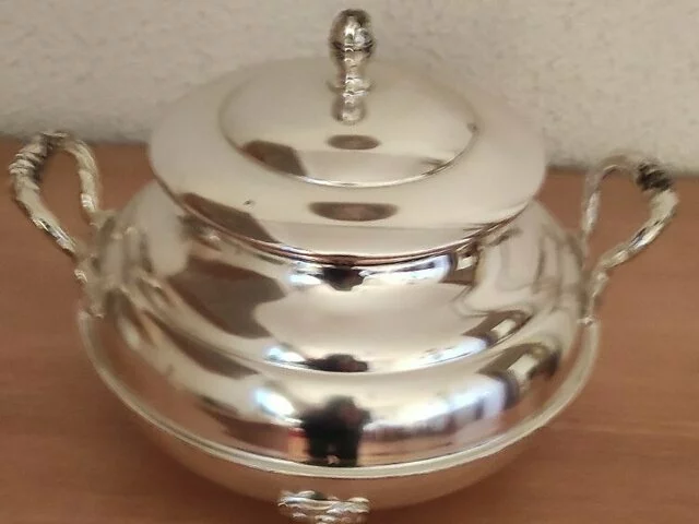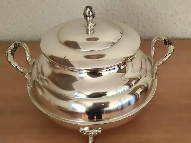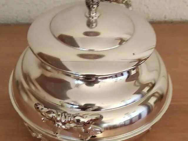 Centro mesa en color plateado con tapa, con alguna pérdida del baño en asas y tapa como se reflejan en las fotos. Medidas aproximadas 25 de ancho x 21 de altura. Recogida en zona Alcampo Moratalaz.