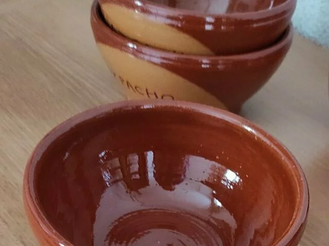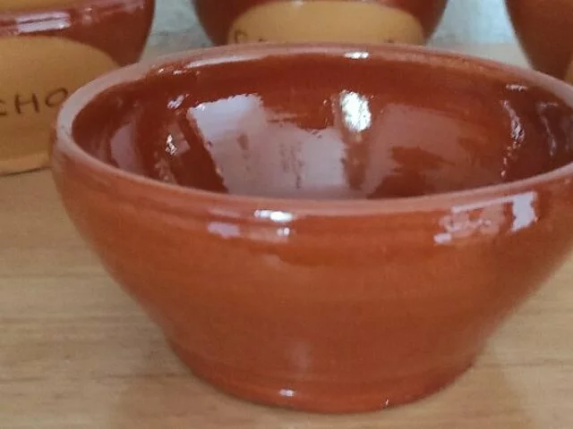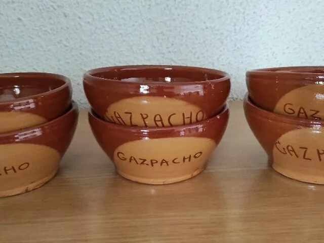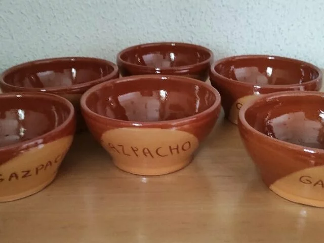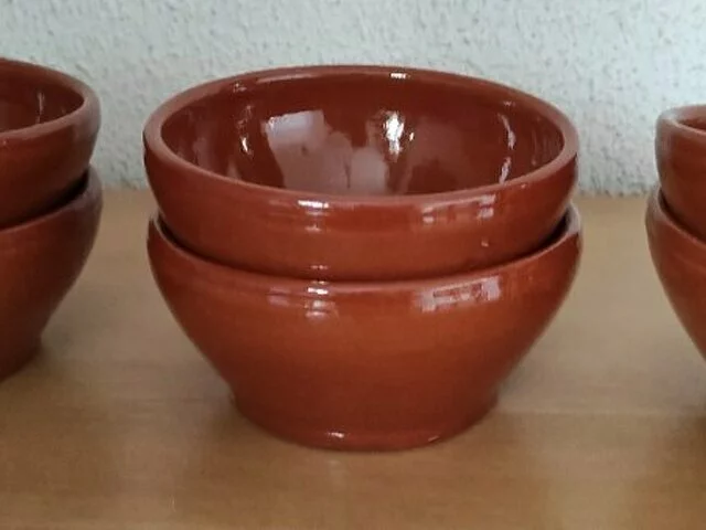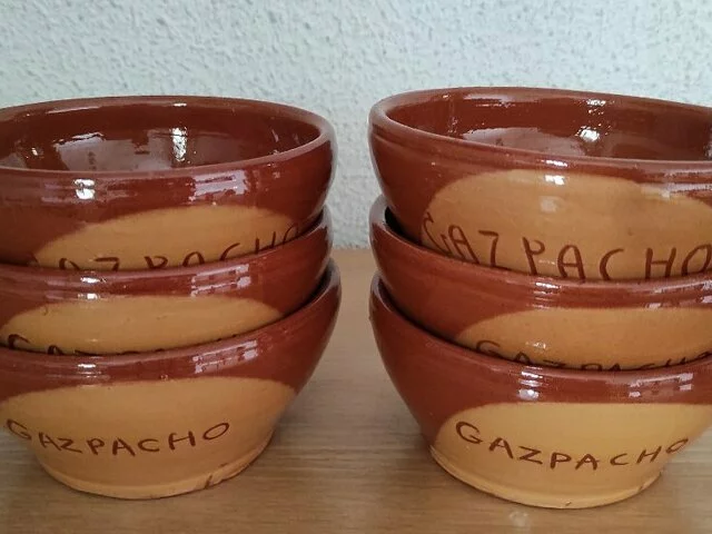 Lote de 6 cuencos de gazpacho de barro esmaltado en brillo, en dos tonalidades clásicas marron y beig. Artesanales. Medidas aproximadas base 8,5, diámetro 13,5 y altura 6. Años 80. No se vende por separado. Recogida en zona Alcampo Moratalaz.