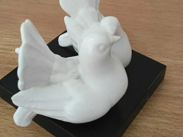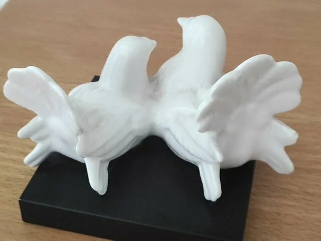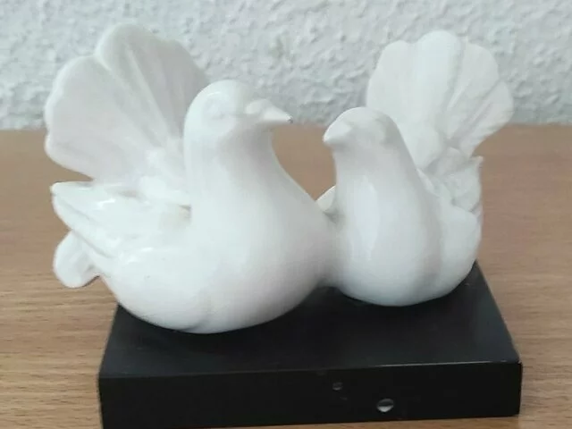 Figura decorativa de palomas gemelas en peana. Las palomas son en color blanco y la peana en color negro, siempre en vitrina. Medidas aproximadas peana base 10x10. Altura 8 centímetros