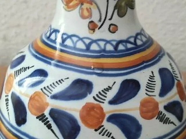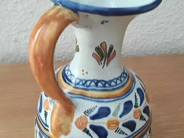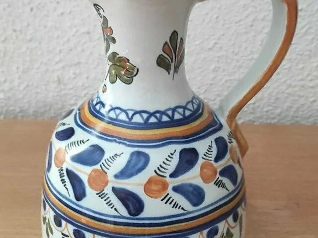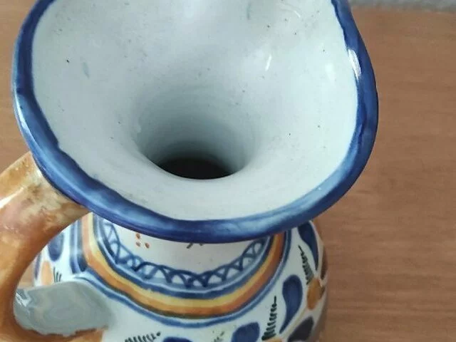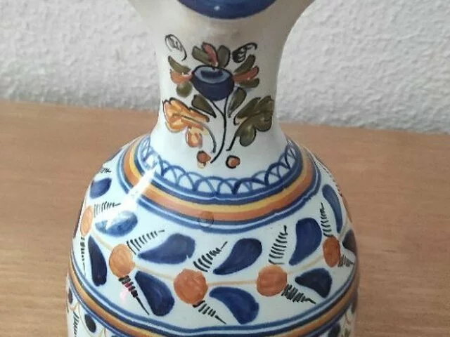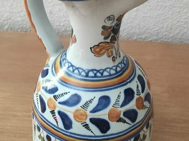 Jarra de cerámica de Talavera de la Reina, con un asa. Temática floral. Tiene un pequeño golpe que se ve en una foto. Medidas aproximadas 21 de altura, 13 de base y ancho de 14. Recogida en zona Alcampo Moratalaz.