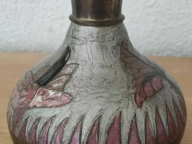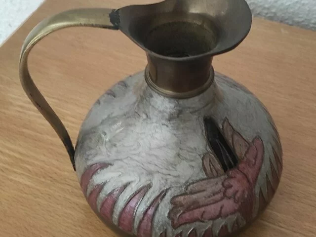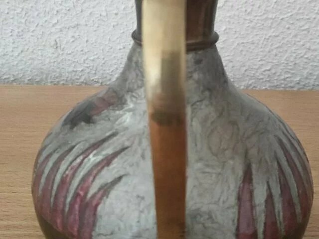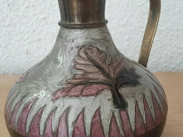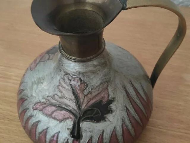 Jarra de metal, bonito adorno con detalles vegetales en tonalidad malvas. Medidas aproximadas base 12 centimetros, altura 16 centímetro ancho totao con el asa 18. Recogida en zona Alcampo Moratalaz.