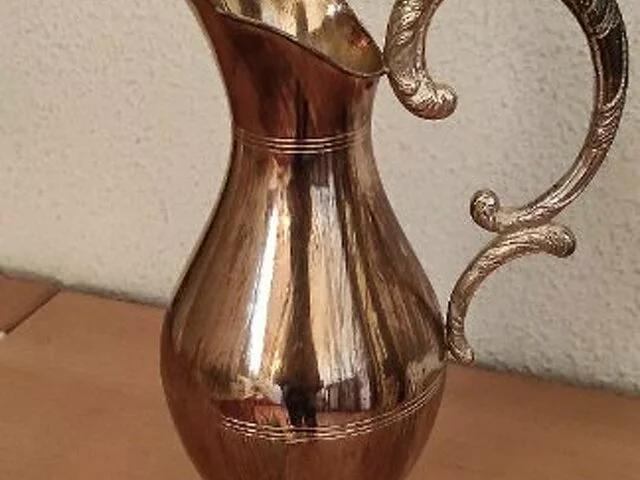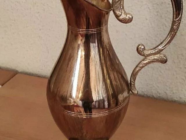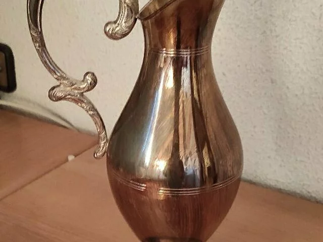 Jarra de metal plateada de alpaca o similar, precisa limpieza por el paso el tiempo, por lo demás como nueva. Mide 31 centímetros de alto y una base de 11 centímetros. Recogida en zona Alcampo Moratalaz. (metro Estrella-linea 9)