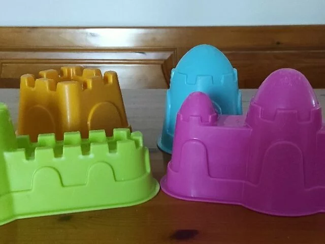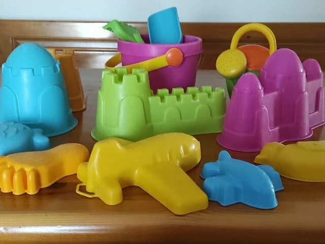 Juguetes playa de la prestigiosa marca "Imaginarium". Son 13 juguetes de plástico muy duros y de muy buena calidad compuestos de cubo, pala, rastrillo, regadera, 4 moldes de castillos y 5 variados. Tienen señales propias del uso. Se entrega en metro Barajas.