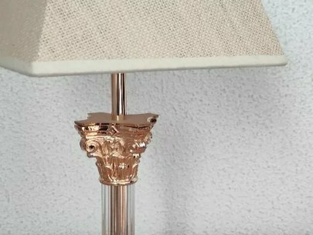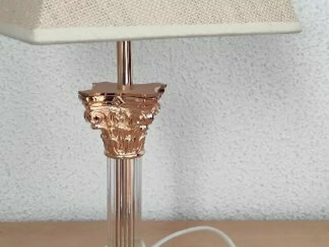 Lampara de mesa, con pie metal dorado y cristal. Tulipa cuadrangular con tejido tipo saco. Altura aproximada 40 centímetros, base 12x12 cms. Recogida zona Alcampo Moratalaz. Metro Estrella/ Vinateros (línea 9 metro). Se escuchan ofertas serias.
