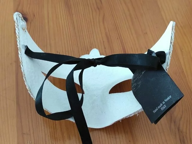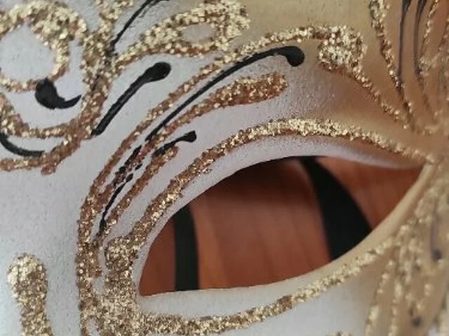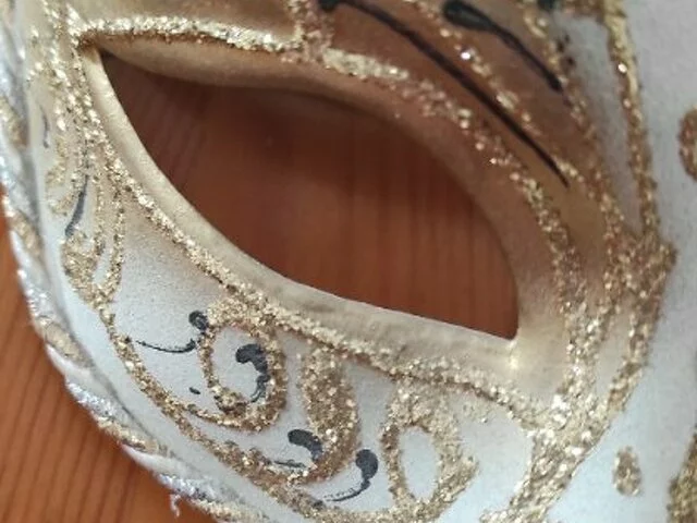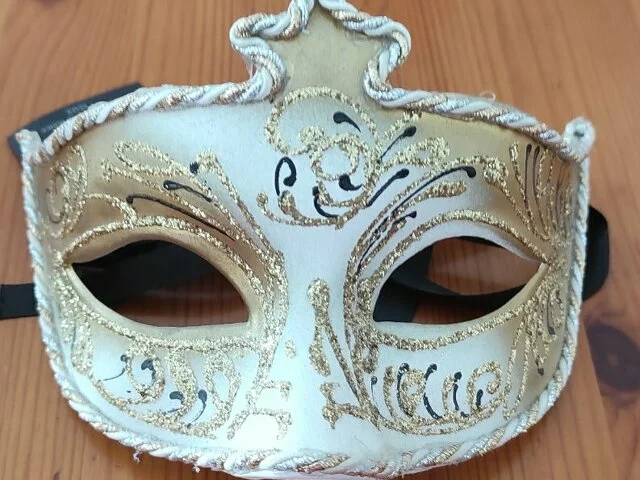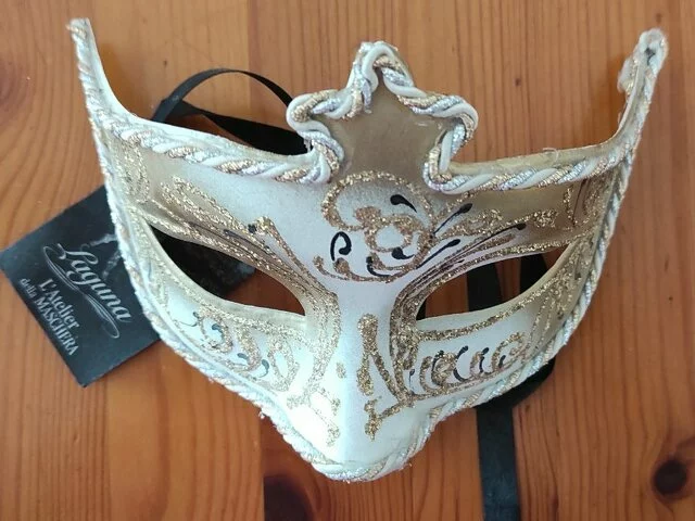 Máscara veneciana original en tonos blancos y dorados, muy elegante. De la prestigiosa marca veneciana Laguna L'atelier della maschere. Pintada a mano como aparece en una de las fotos. Recogida metro Barajas.