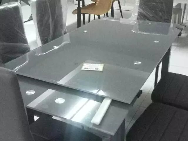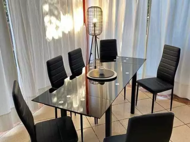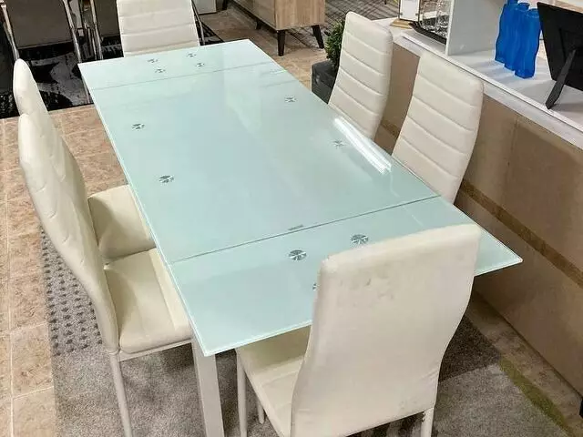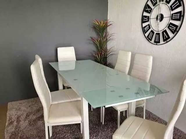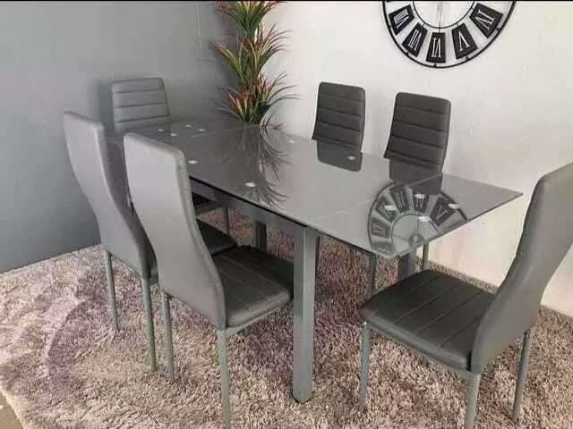 mesa extensible de vidrio templado de 8 mm de grosor con patas y estructura metalica resistentes +6 sillas de poli piel acolchado con estructura soporta hasta 120 kilos.