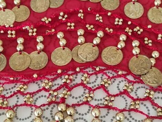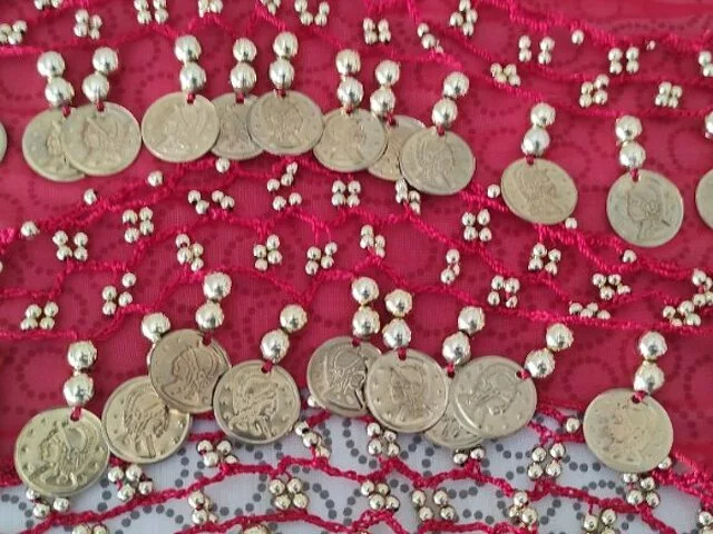 Pañuelo danza vientre en color rojo y monedas doradas, apenas utilizado en un par de ocasiones. Medidas aproximadas ancho total 160, ancho 80, largo 27. Pañuelo danza vientre en color azul y monedas plateadas, apenas utilizado en un par de ocasiones. Medidas aproximadas ancho total 160, ancho 80, largo 27. Recogida en metro Barajas.