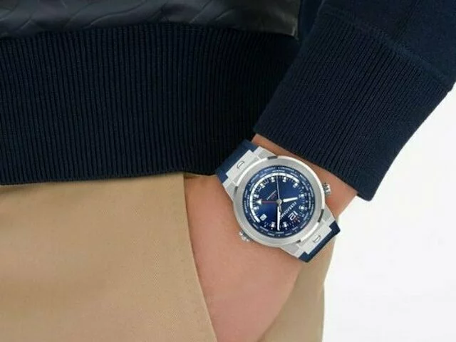 www.eltesorodeplata.com Características principales Movimiento: Cuarzo suizo Ronda 515.24H GMT. Caja: Acero inoxidable, diámetro 43 mm. Cristal: Zafiro antirreflejo y resistente a rayaduras. Correa: PU reciclado o brazalete de acero, según versión. Resistencia al agua: 10 ATM (100 m). Funciones: Hora local. Aguja GMT para segundo huso horario. Indicador de zonas horarias mundiales. Diseño: Esfera azul con acabado soleil, detalles en blanco y rojo, estética deportiva y elegante.