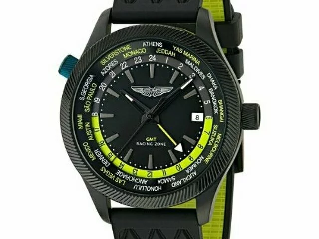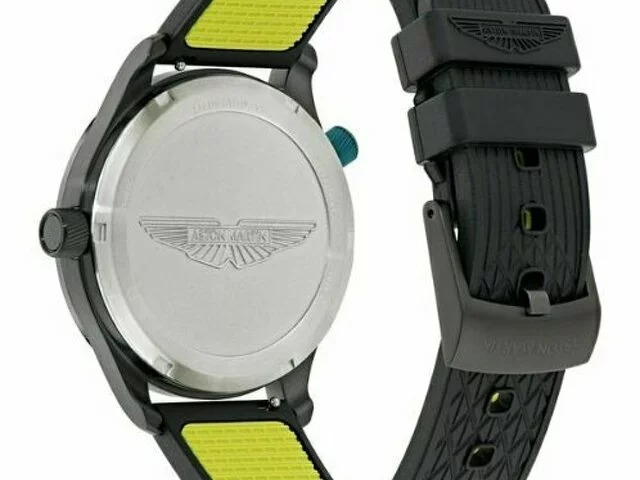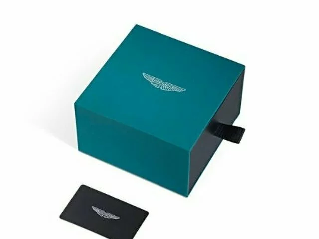 Diseño exclusivo: Caja de acero inoxidable en acabado negro, con líneas inspiradas en la parrilla icónica de Aston Martin.