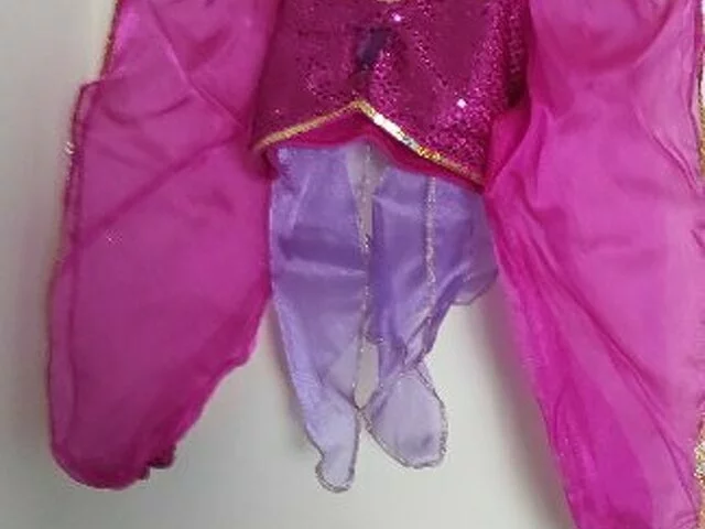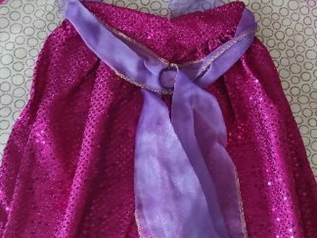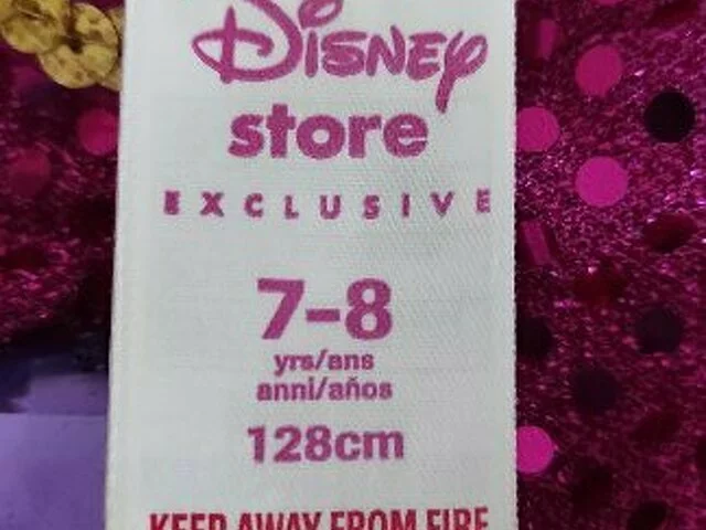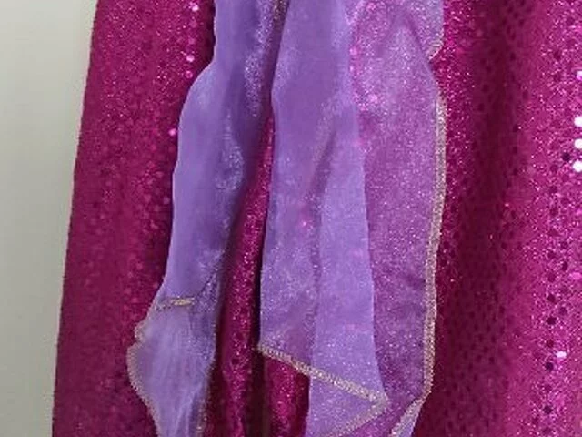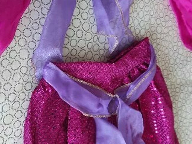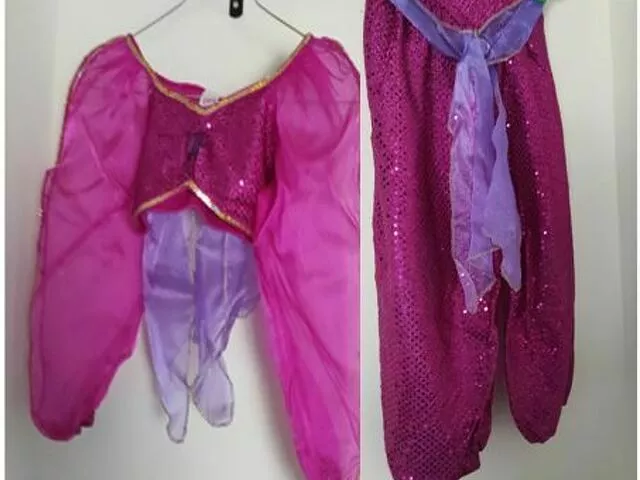 Disfraz Jasmine de la película Disney de Aladdin. Compuesto de 2 piezas de color fucsia y malva de lentejuelas. Comprado en Disney store exclusive en los año 2000 muy bonito y original. Descatalogado.