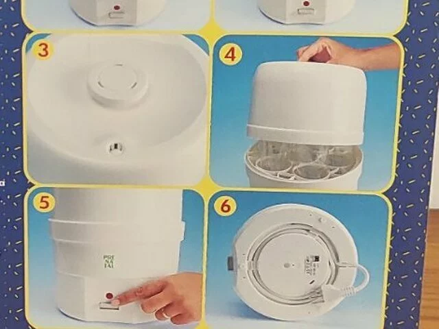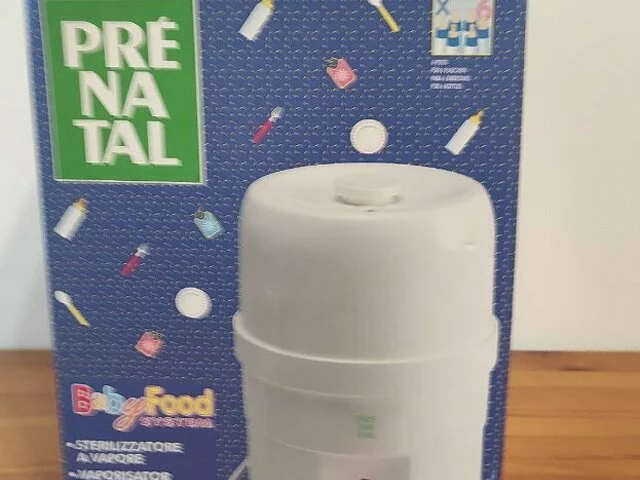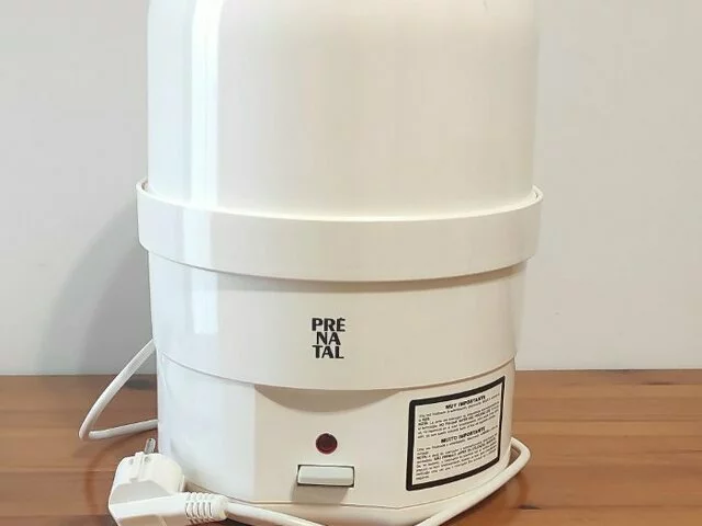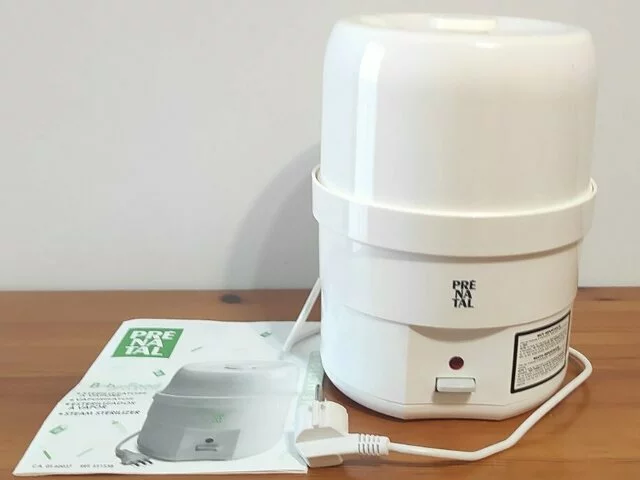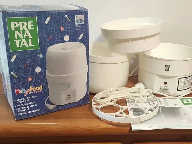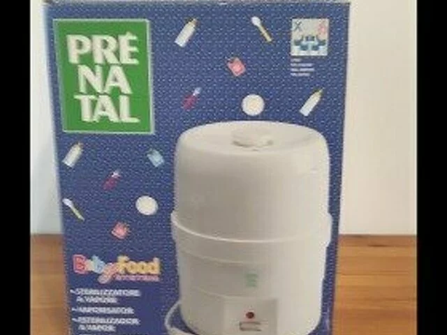 Esterilizador eléctrico de biberones de la marca Prenatal, con capacidad para 6 biberones. Perfecto para esterilizar biberones y accesorios de bebé. Esterilizador al vapor con sistema Babyfood. Incluye bandeja y pinzas. Medidas aproximadas 28 de altura y 21 de diámetro. En buen estado.