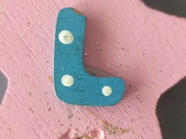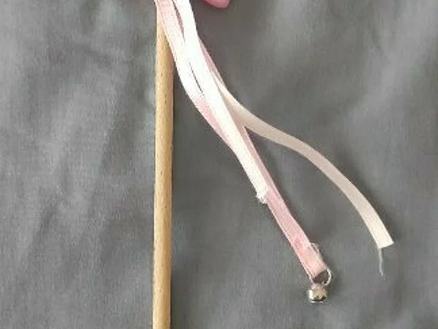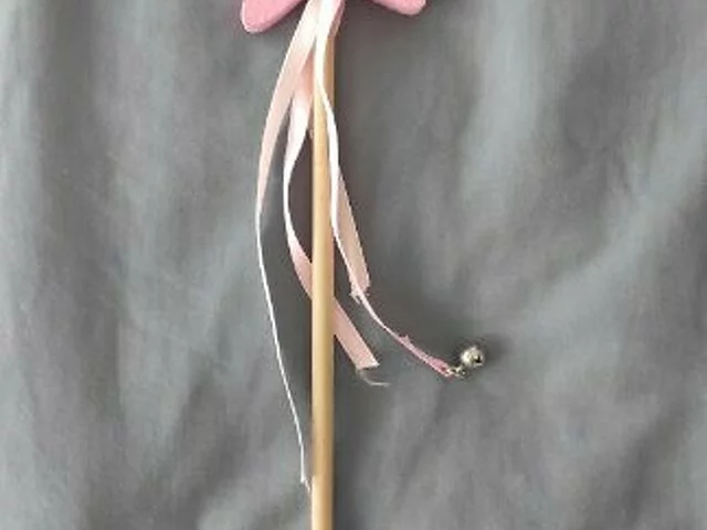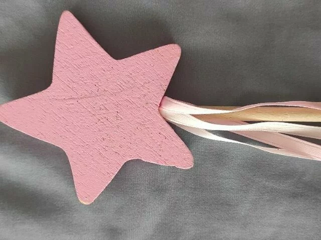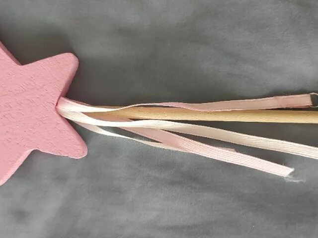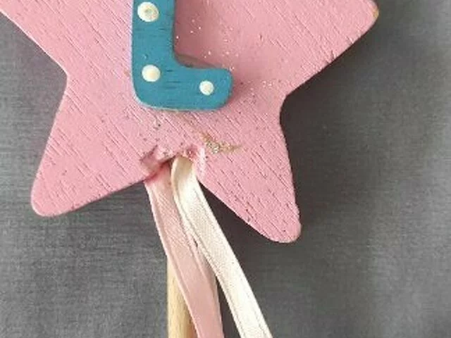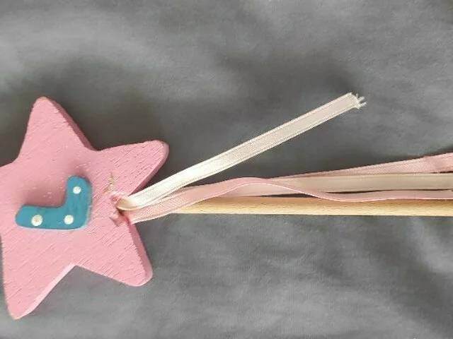 Varita artesanal de madera pintada en color rosa palo, con lacitos de la misma tonalidad y cascabel. Con una la inicial "L" pegada en color azul y purpurina. Medidas aproximadas: largo total 30, estrella 8 centímetros. Recogida en metro Barajas (línea 8).
