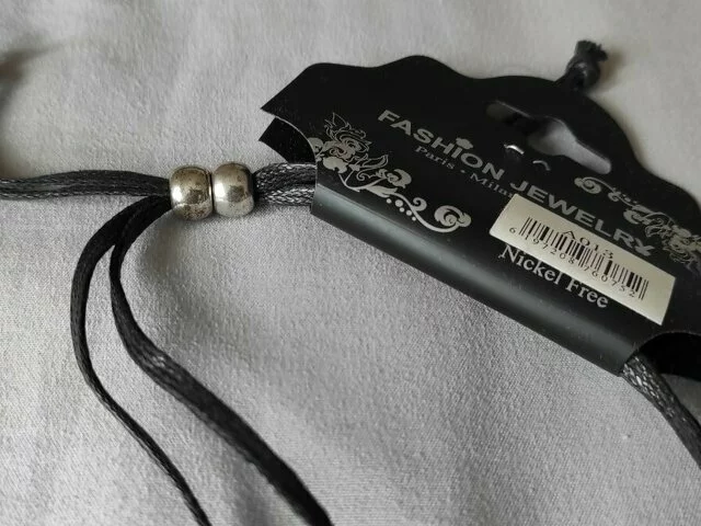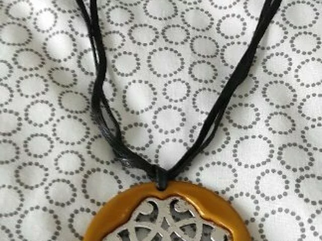 Colgante redondo de bisutería con detalles en metal y perímetro tipo esmalte, con 7 centímetros de diámetro. Cordón tipo cuero regulable. Con etiqueta. Ideal para regalo. Recogida en metro Barajas