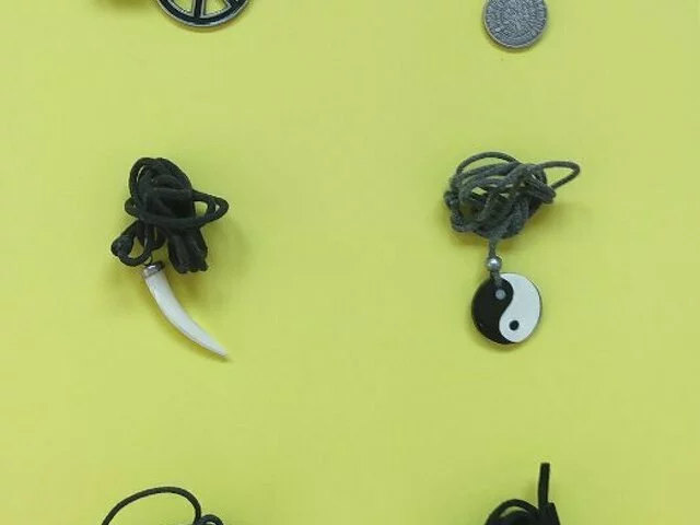 Colgante redondo de bisutería con detalles en metal y perímetro tipo esmalte, con 7 centímetros de diámetro. Cordón tipo cuero regulable. Con etiqueta. Ideal para regalo. Recogida en metro Barajas