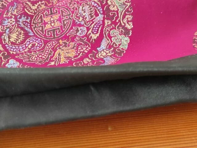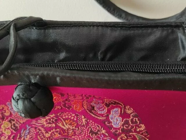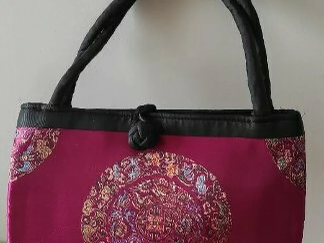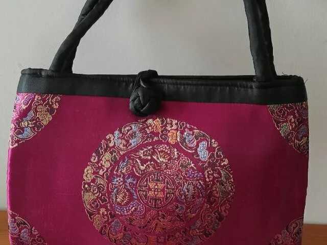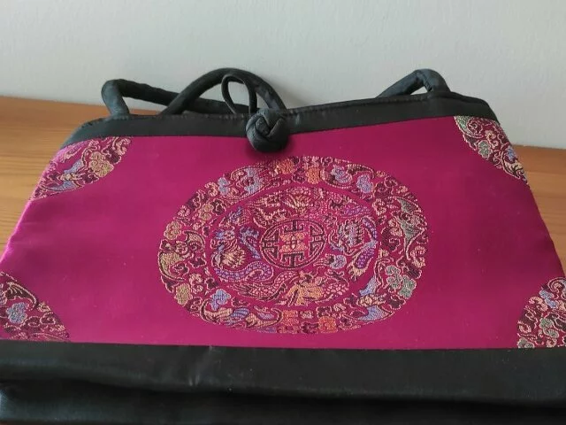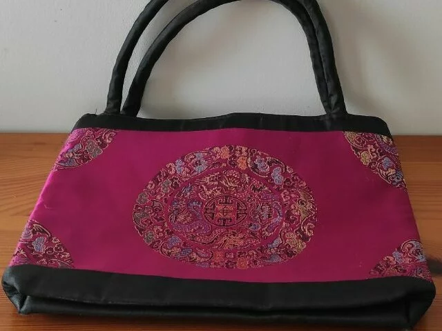 Bolso chinesco con fondo tonos rosados y morados y estampados tipo seda. Medidas aprox. Alto 28x21x5. Con asa 35. Nunca utilizado. Recogida zona metro Barajas.