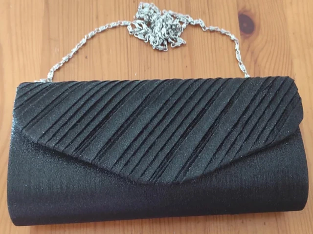 Bolso negro con brillos para fiestas y ceremonias. Con correa metálica plateada y bolsillo interior. Medidas aproximadas en centímetros 20x10. Nunca utilizado, aunque tiene pequeña tara en la base. Precio negociable. Recogida en metro Barajas (línea 8 metro Madrid.