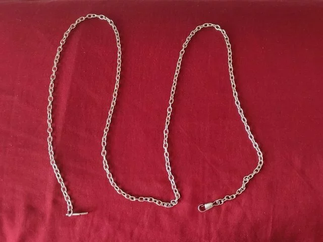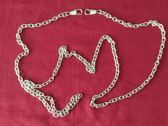 Cadena para bolso de metal en color plateado, con una longitud aproximada de 115 centímetros, con enganches para poner fácilmente en el bolso. Como nuevo, a estrenar, en su embalaje original.