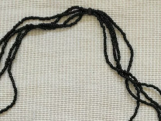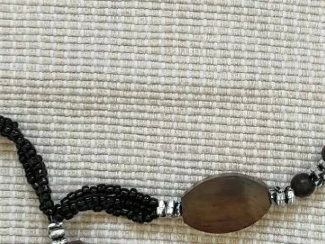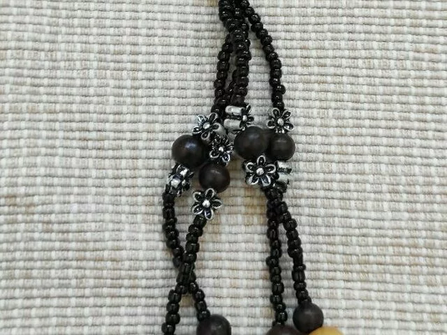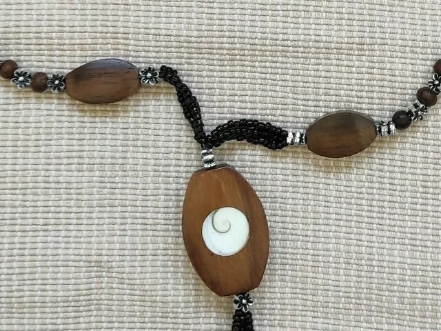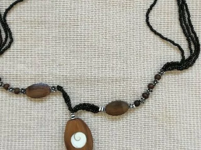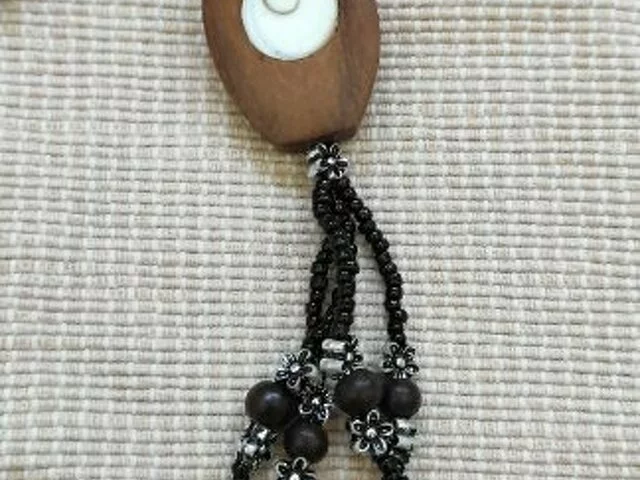 Colgante en madera y bolitas negras de estilo tribal. Recogida metro Barajas.