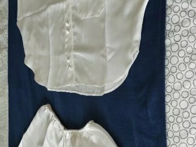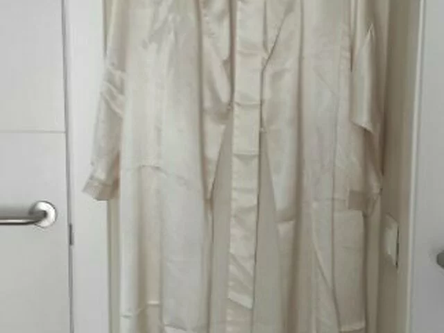 Conjunto de pijama y bata similar seda. El pijama es de dos piezas la parte de arriba es de manga caída y pantalón cortito, con sus botones forrados de la misma tela. . Bata a juego con bolsillos laterales. Muy fresquito y elegante. Comprados en Mark & Spencer prestigiosa marca de U.K. Talla equivalente a la 40.