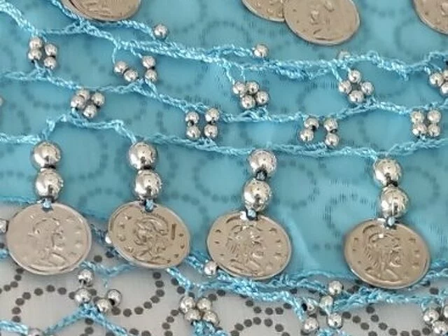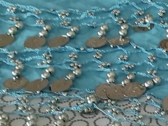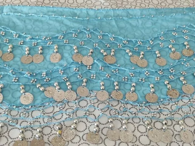Pañuelo danza vientre en color azul y monedas plateadas, apenas utilizado en un par de ocasiones. Medidas aproximadas ancho total 160, ancho 80, largo 27. Recogida en metro Barajas