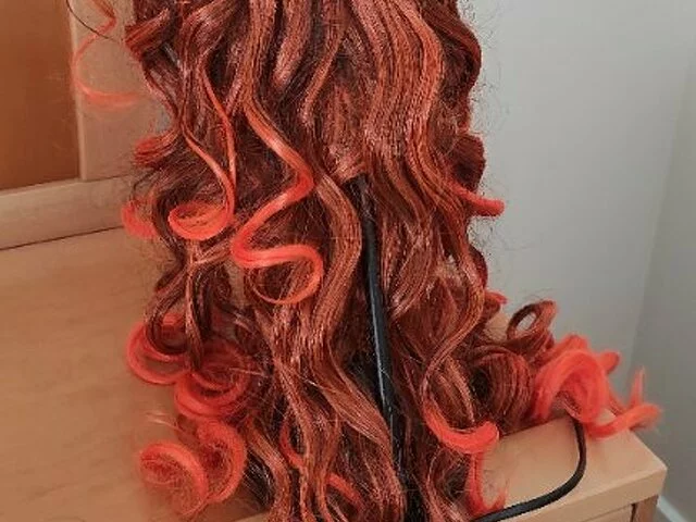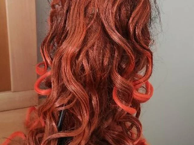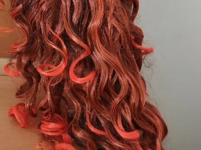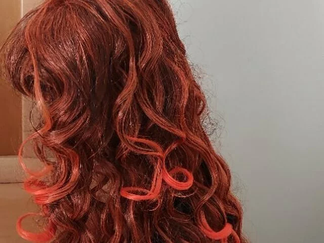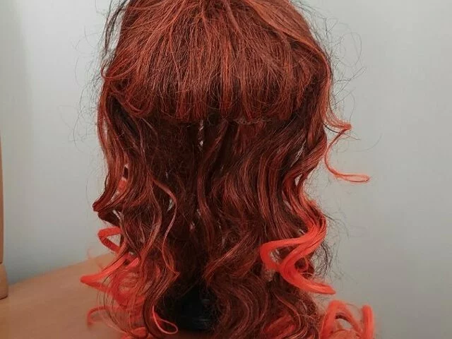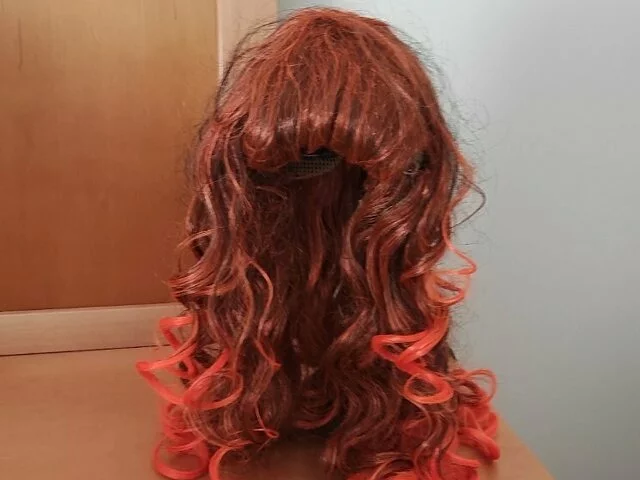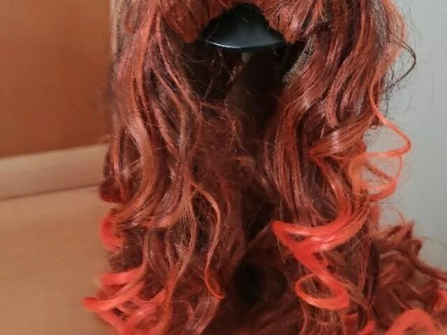 Peluca nunca utilizada, sintético con melena ondulada en tonos anaranjados y flejillo, con redecilla para ponertela mejor. Largo aproximado 47 centímetros, flequillo 10 centímetros, Ideal para cosplay, carnavales, halloween. Recogida en metro Barajas.