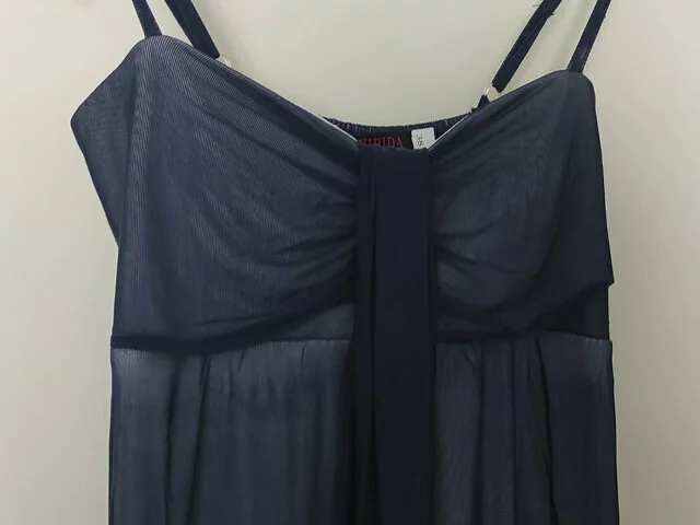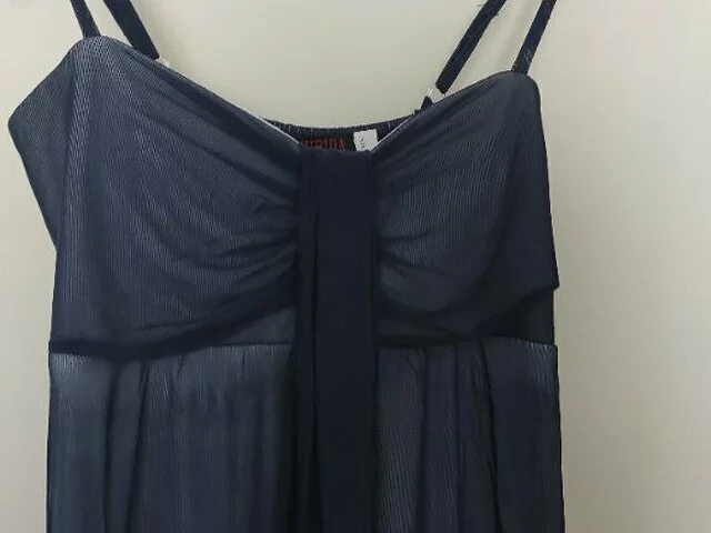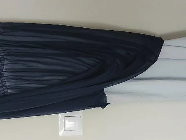 Vestido largo de ceremonia en color azul traslúcido y forro blanco. Talla 38. Medidas aproximadas: 33 de ancho por la parte de pecho (total 66), largo total 120 (largo falda 105 y corpiño pecho 15). Composición 100% poliéster. Con pañuelo del mismo tejido y color a juego (190x 42) Solo una puesta. Se entrega limpio. Recogida en metro Barajas.