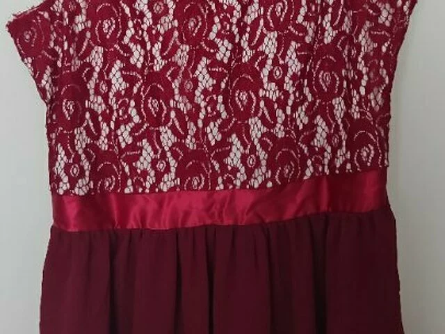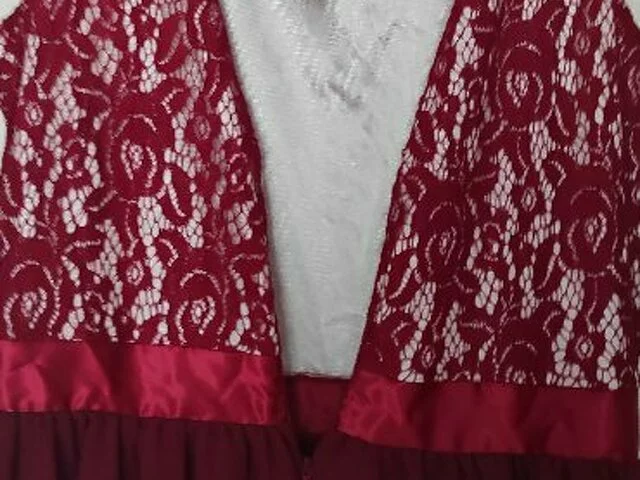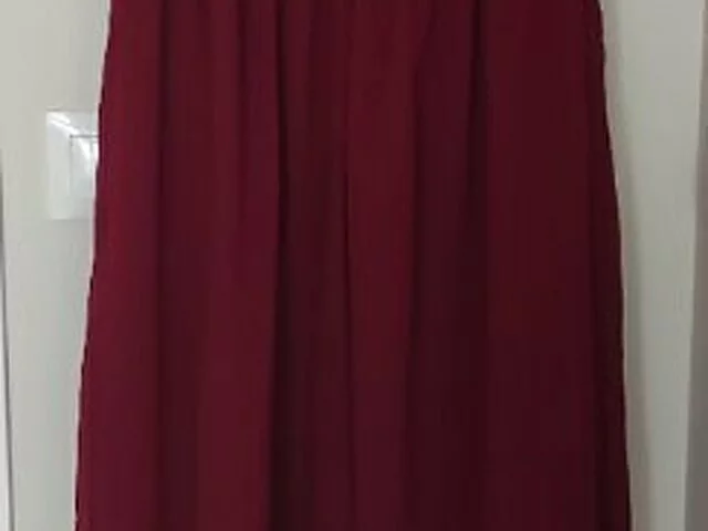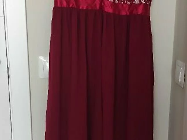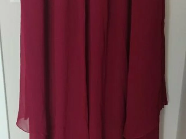 Vestido largo de ceremonia en color granate. Parte arriba con encaje y forro en beig, la parte de atrás en pico, y cierre con cremallera. La parte de la falda tiene sobrefalda del mismo color. Talla XL- Medidas aproximadas: largo total 143, sisa 50, largo falda 108, sobrefalda 74, Composición: 97 poliéster y 3 elastano . Se acompaña con pañuelo negro. Solo una puesta. Se entrega limpio. Recogida en metro Barajas