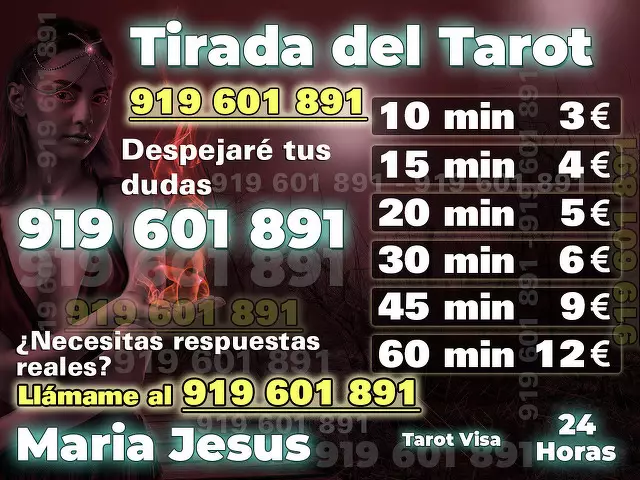 ¿Tienes problemas financieros? ¿Dudas en el amor? ¿Deseas saber si ese trabajo te conviene? ¿Sientes que tu camino esta trancado? Llama y consulta el Tarot para aclarar tus dudas. Te brindo Profesionalidad y Honestidad. Llama al 919601891. 10 Min - 3 € / 15 Min - 4 € / 20 Min - 5 € / 30 Min - 6 € / 45 Min - 9 €. / 60 Min - 12 €.