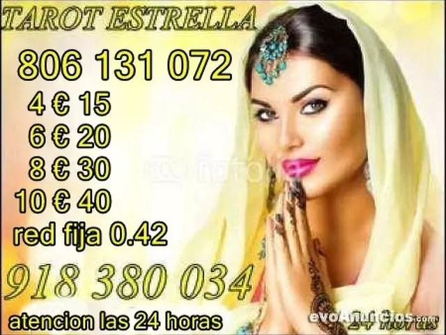 806002038 y 806002149 Tarot Económico: 0,42€ Por Min y 932424782 y 918380034 - 4€ 15 mts. 6 € 20 mts. 10€ 40 mts. 12€ 45 mts 20 € 90 mts todas tus preguntas No dudes en consultarme, siempre tendrás una respuesta a te el poder de mi Videncia, las Gemas, las Runas y diversos Tarots y Oráculos que me ayudaran visualizar todo lo que te preocupa y darle solución precisa....... te esperamos las 24 horas del día. Sólo mayores de 18 años. Servicio prestado. M.A.L. Apartado de correos 164 (46002) Valencia