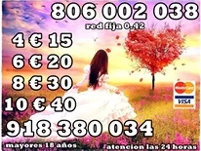 806002038 y 806002149 Tarot Económico: 0,42€ Por Min y 932424782 y 918380034 - 4€ 15 mts. 6 € 20 mts. 10€ 40 mts. 12€ 45 mts 20 € 90 mts todas tus preguntas No dudes en consultarme, siempre tendrás una respuesta a te el poder de mi Videncia, las Gemas, las Runas y diversos Tarots y Oráculos que me ayudaran visualizar todo lo que te preocupa y darle solución precisa....... te esperamos las 24 horas del día. Sólo mayores de 18 años. Servicio prestado. M.A.L. Apartado de correos 164 (46002) Valencia