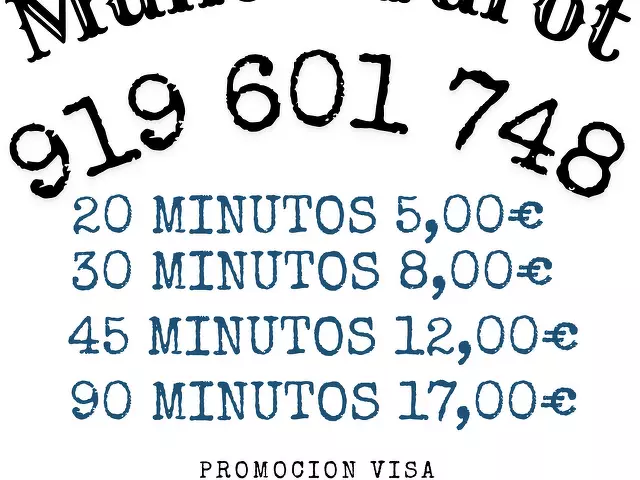 Te ofrecemos respuestas directas y sin rodeos a tus preguntas dándote la mejor solución para ti. Aquí encontrarás Tarotistas, Videntes, Médiums, Clarividentes.... todo para darte el 100% de aciertos. Estamos disponibles las 24 h 921920110 oferta visa 15 minutos 4 euros ,20 minutos 5 euros , 40 minutos 8 euros , 60 minutos 14 euros y 90 minutos 17 euros quier...