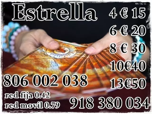806002038 y 806002149 Tarot Económico: 0,42€ Por Min y 932424782 y 918380034 - 4€ 15 mts. 6 € 20 mts. 10€ 40 mts. 12€ 45 mts 20 € 90 mts todas tus preguntas No dudes en consultarme, siempre tendrás una respuesta a te el poder de mi Videncia, las Gemas, las Runas y diversos Tarots y Oráculos que me ayudaran visualizar todo lo que te preocupa y darle solución precisa....... te esperamos las 24 horas del día. Sólo mayores de 18 años. Servicio prestado. M.A.L. Apartado de correos 164 (46002) Valencia