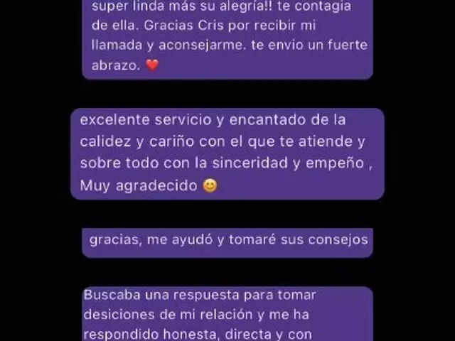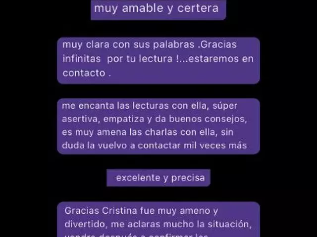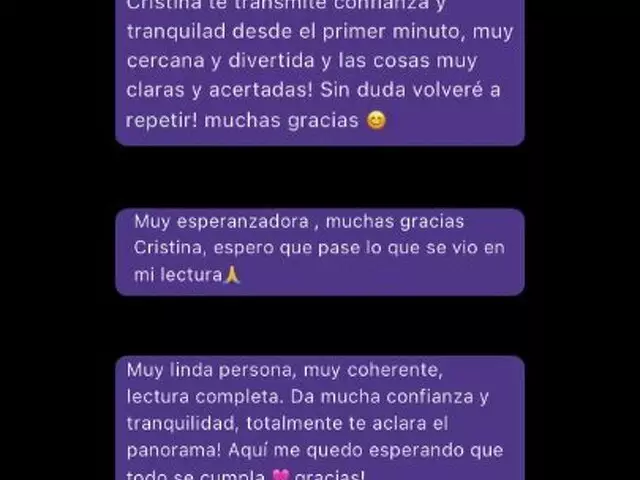 ¡Hola! soy Cristina, vidente. Tengo un nivel de aciertos altísimo (y mis cientos de reseñas lo confirman). Además, realizo rituales personalizados, 100% adaptados a tu energía, para lo que necesites, amor, trabajo, dinero,...