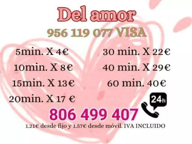 ¿Te gustaría saber qué te depara el futuro sentimental? ¿Te inquieta algún aspecto de tu vida y necesitas esclarecerlo? Si es así, el tarot puede darte las respuestas que estás buscando ,con un llamado al tarot puedo ayudarte y darte una solución al 919 992 810 desde 5 euros los 15 minutos. o ha nuestro Tarot Barato al 806 00 21 68/Tarot Alexandra. Imp. Inc....