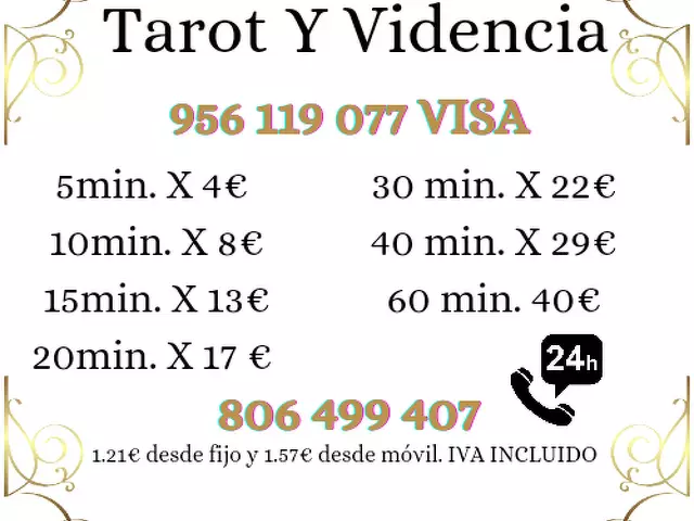 Tarot visa y Videncia Natural , siente la energía de la magia, consulta con profesionales de verdad Visa 910312450 desde 4 € 15 min/ 7 € 25min/ 9€ 35min. / 10€40 min 12€ 45min/ 15€ 60min / 17€ 70min. 20€ 90min .806002109 desde Coste min. 0,42/0,79 cm € min red fija/móvil, déjame ver tu futuro en cualquier tema que te preocupe resolver /La llamada se corta so...