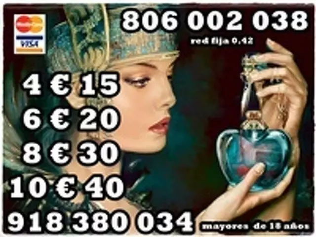 806002038 y 806002149 Tarot Económico: 0,42€ Por Min 932424782 y 918380034 por 4 € 15 mts. 6 € 20 mts. 10 € 40 mts. 15 € 55 mts Toda mi ayuda y experiencia de 30 años estará a tu alcance Pondré en juego tanto mi sabiduría como mi poder espiritual para ayudare en la resolución de tus problemas así saldremos adelante! Es con la videncia y las cartas te esperamos las 24 horas del día. Sólo mayores de 18 años. Servicio prestado. M.A.L. Apartado de correos 164 (46002) Valencia